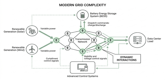 The increasing role of inverter-based resources, battery storage, and dynamic loads means that system behavior is defined by how components interact in real time.