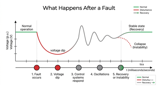 A fault occurs. A generator trips. A large load ramps or drops. Protection systems act. Controls respond.